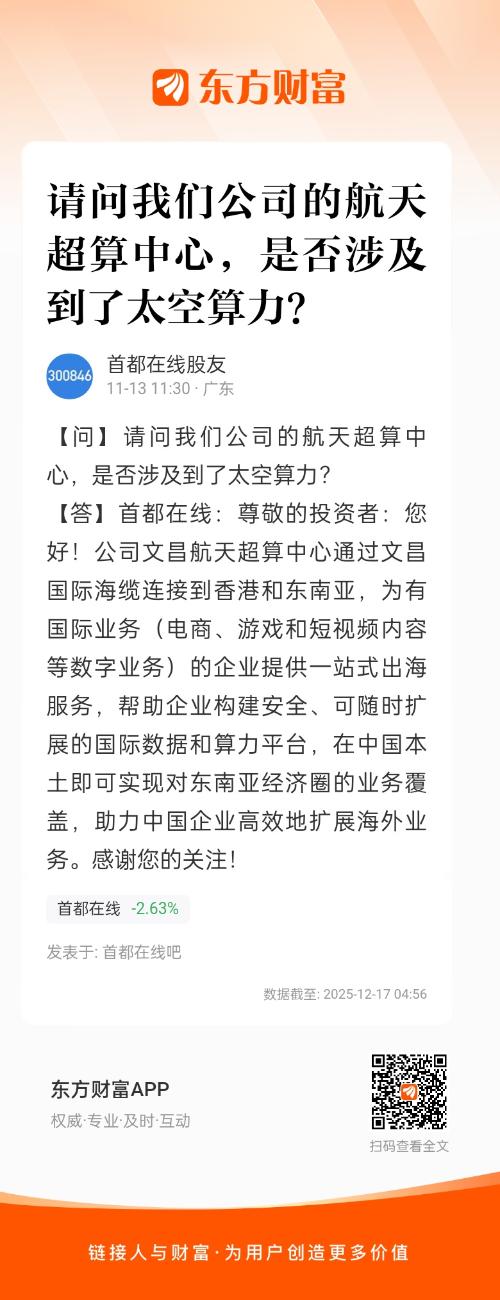 尊敬的投资者:您好!公司文昌航天超算中心通过文昌国际海缆连接到香港和东南亚,为有国际业务(电商、游戏和短视频内容等数字业务)的企业提供一站式出海服务,帮助企业构建安全、可随时扩展的国际数据和算力平台,在中国本土即可实现对东南亚经济圈的业务覆盖,助力中国企业高效地扩展海外业务。感谢您的关注!
