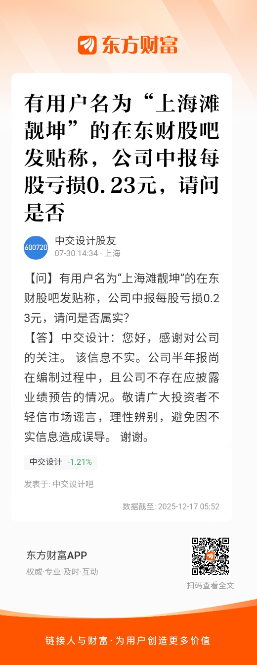 有用户名为“上海滩靓坤”的在东财股吧发贴称,公司中报每股亏损0.23元,请问是否属实?