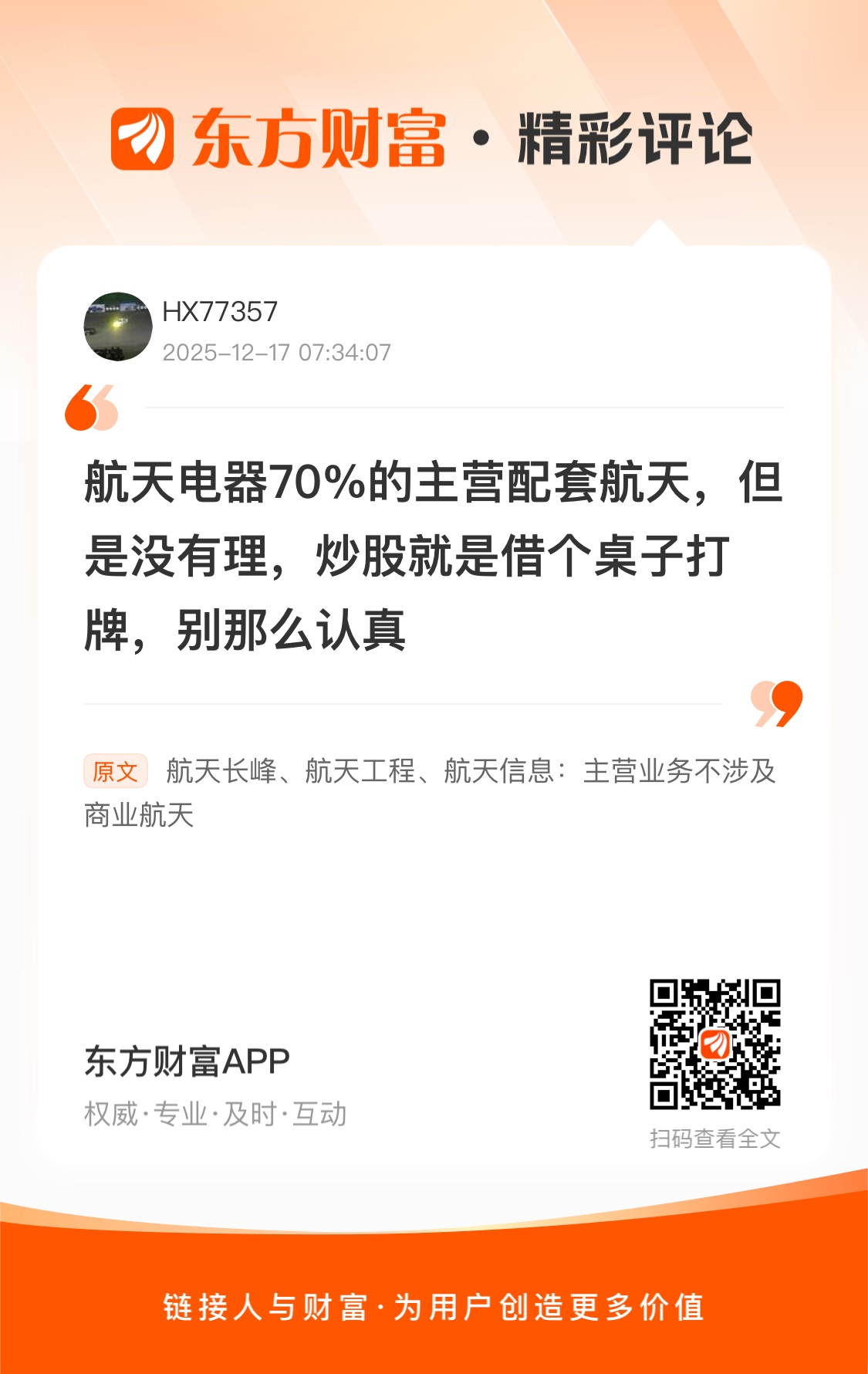 航天电器70%的主营配套航天,但是没有理,炒股就是借个桌子打牌,别那么认真我在《
