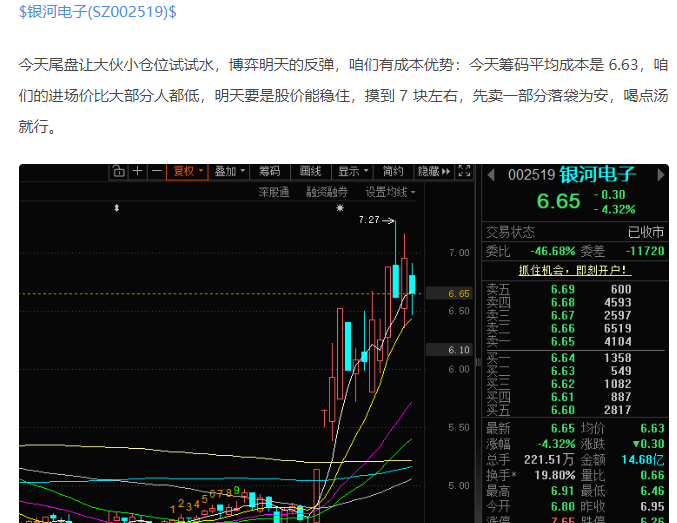 这票不是没题材的股,身上挂着军工、商业航天这些当前热门标签,加上昨天尾盘已经有了小幅度回稳的迹象,这是短期跌后的一个小支撑点,昨日尾盘买入博弈今天股价反弹,就算亏也亏不了多少,要是反弹摸到 7 元附近就能轻松获利,相当可以做个超短吧,要是明天低开跌破10日线没有快速反弹回来,就止损出场。