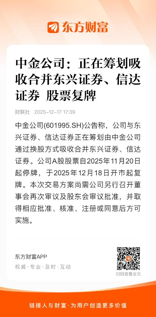 备受市场瞩目的中金公司吸收合并东兴证券、信达证券,迎来重要进展。