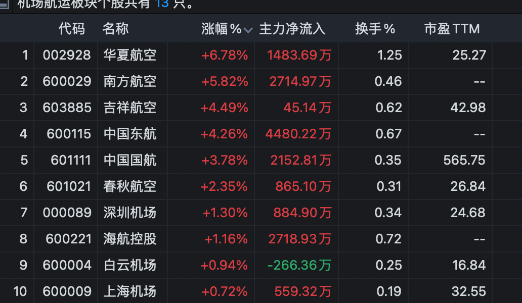 5. 中国国航,暴涨3%,国内旗舰级航司