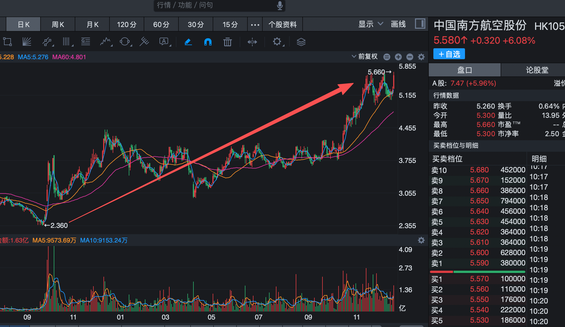 比如中国南方航空。这一波牛市股价从2.36港元一路涨到现在的5.58港元,今天股价新高,从底部起来已经翻倍了。