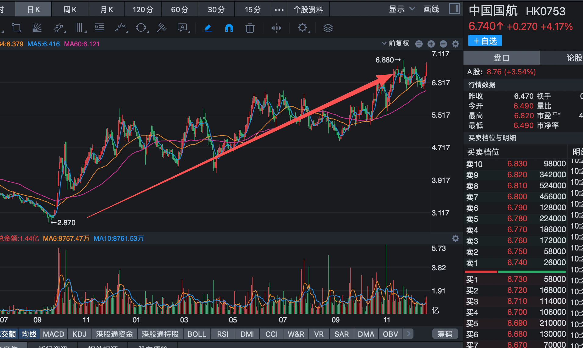 中国国航也是这样,这一波牛市股价从2.87港元一路涨到现在的6.88港元,要知道最近一段时间港股跌的非常惨,这么惨的情况下,中国国航股价新高,底部起来翻倍了。