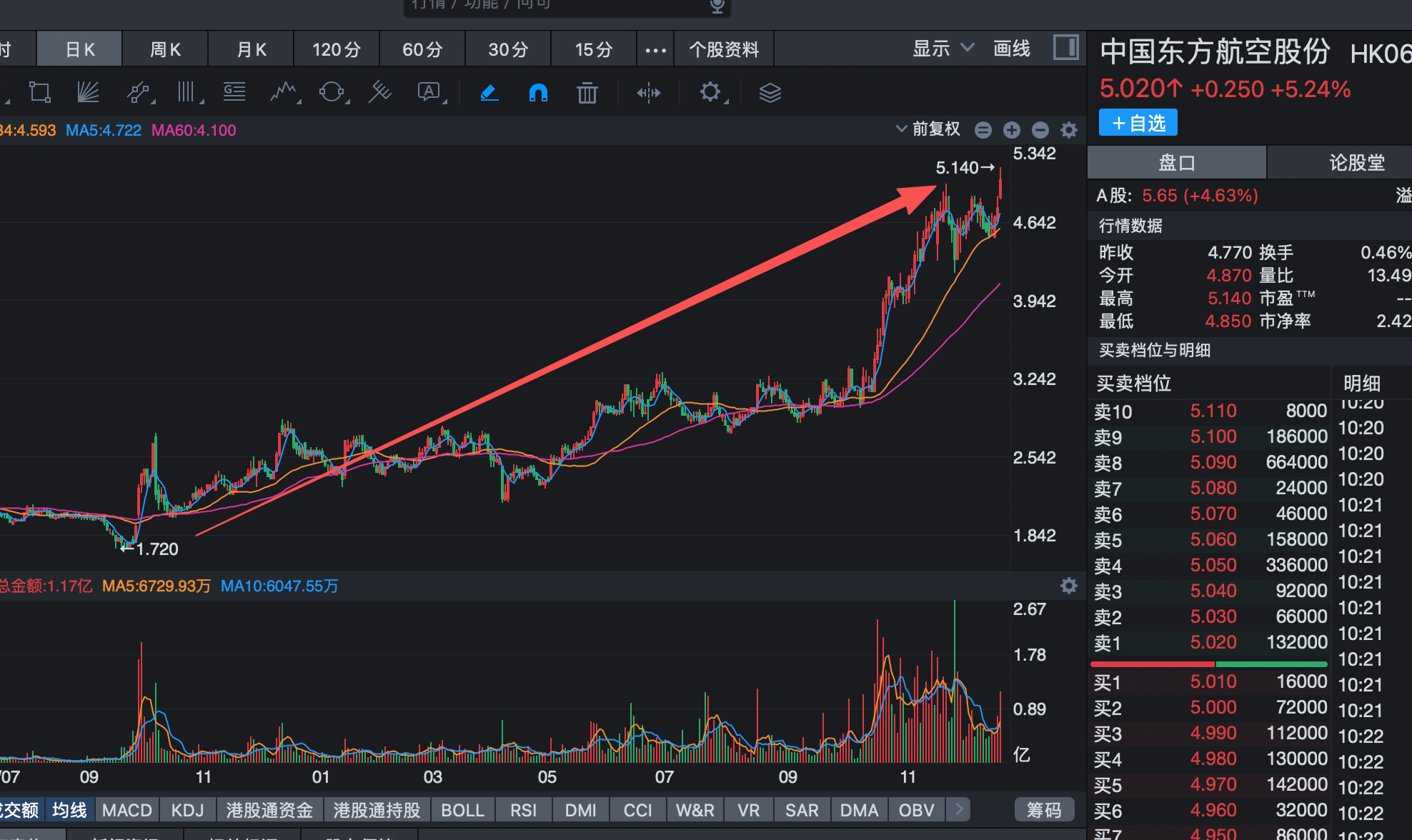 中国东方航空表现更夸张,这一波牛市股价从1.72港元一路涨到现在的5.14港元,今天创出新高,这一波牛市股价涨幅接近3倍了。
