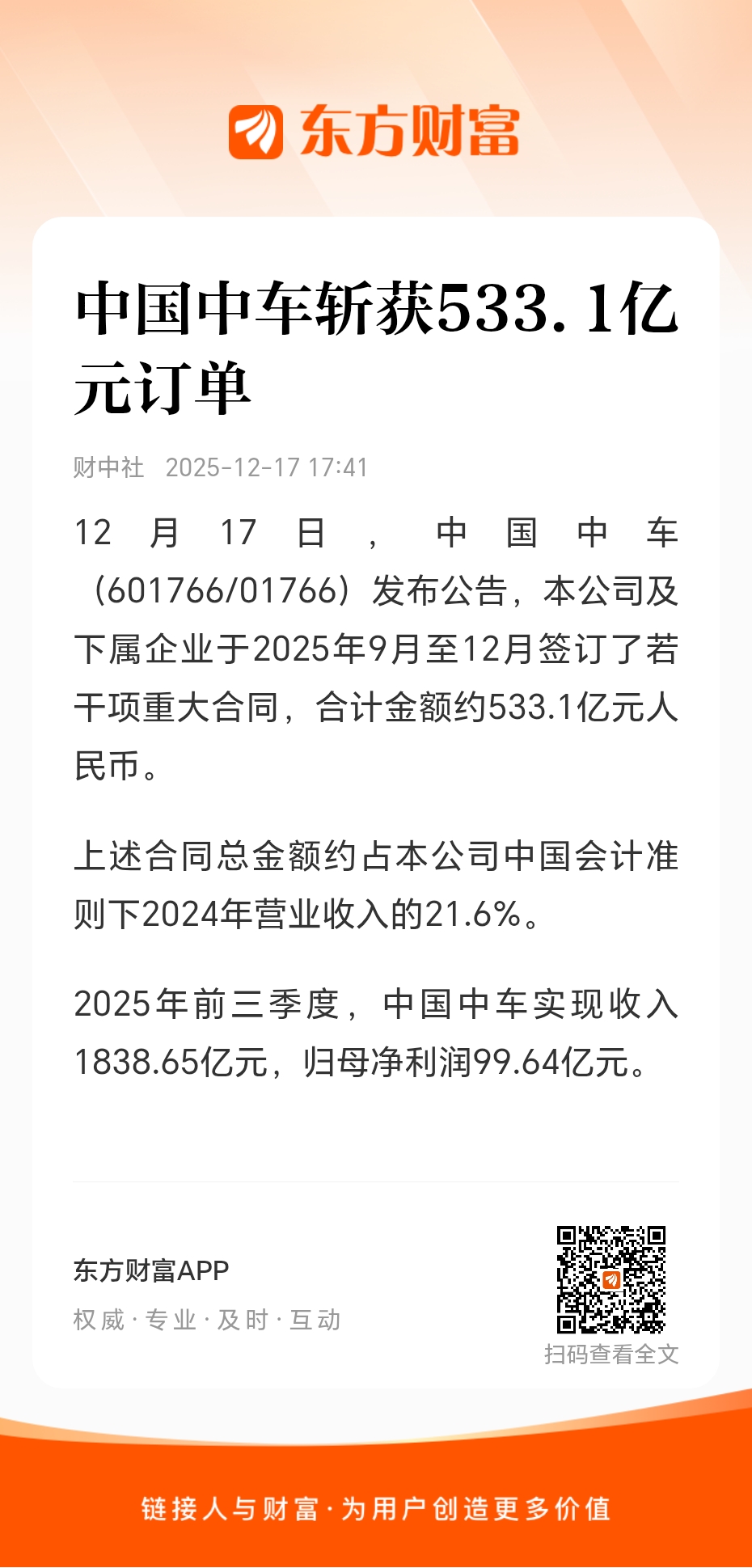 12月17日,中国中车(601766/01766)发布公告,本公司及下属企业于2025年9月至12月签订了若干项重大合同,合计金额约533.1亿元人民币。