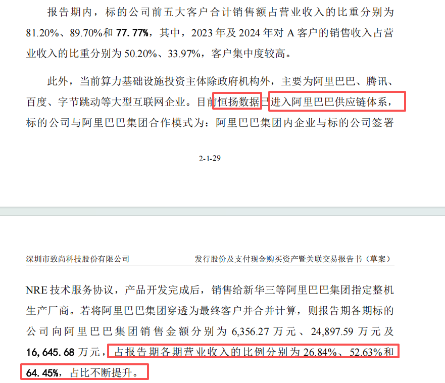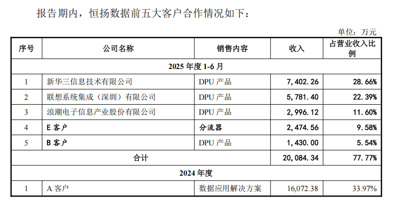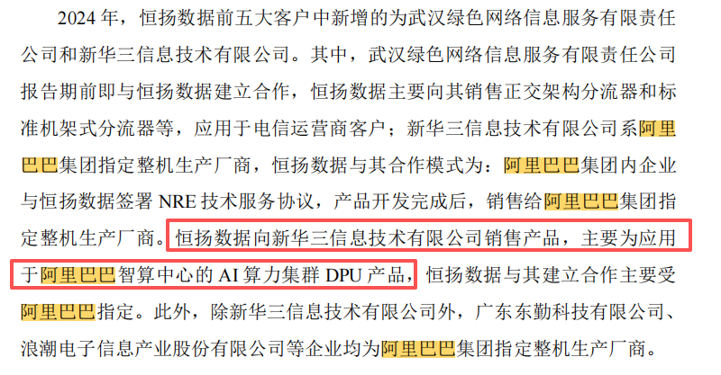 恒扬数据是国内领先的DPU供应商,也是A股唯一纯正DPU标的、国产DPU中唯一实现规模化营收的企业:2024年实现收入4.7亿元,同比接近翻倍,净利润9000万元;预计2025年营收将达10亿元,净利润1.5亿元,2027年DPU业务净利润有望增至4亿元。其客户结构极具优势,深度绑定阿里生态,2024年向阿里销售额2.49亿元,占营收52.63%,2025年1-6月穿透后占比已达64.45%,同时与华为合作紧密,覆盖一带一路政府大客户、新凯来等,兼具国产算力、国产设备多重属性。