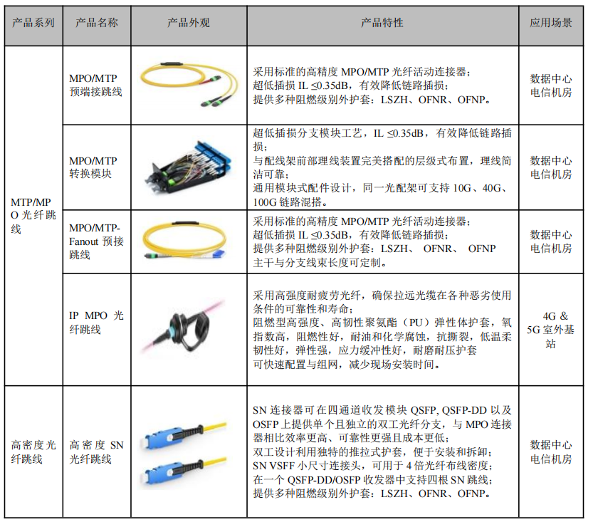 公司光通信产品以光纤连接器为核心,已形成门类齐全、品种繁多的产品系列,全面适配数据中心、电信机房、5G 基站等主流应用场景: