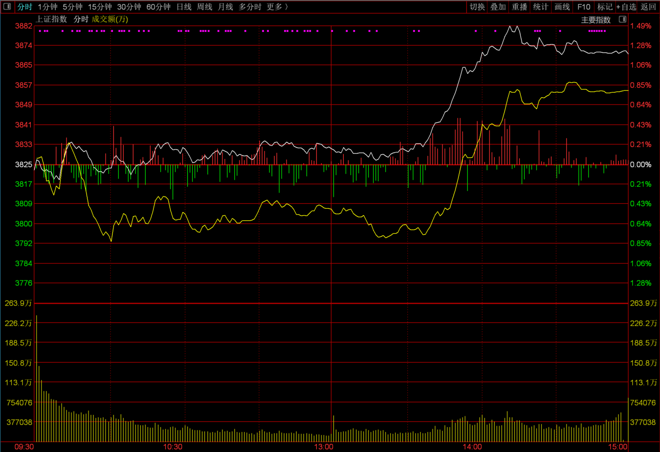 其实就在市场命悬一线的时候,如果下午市场再没有增量资金,那么指数就真的会出现下挫,与之而来的是抛盘的增加,所以13点30分之后,大家会发现突然之间一股强大的资金快速的将指数拽了起来,沪指在短短的35分钟上涨了50点,涨幅达到了1.49%,盘中指数最高到了3881点,创业板指数则上涨了3.58%。