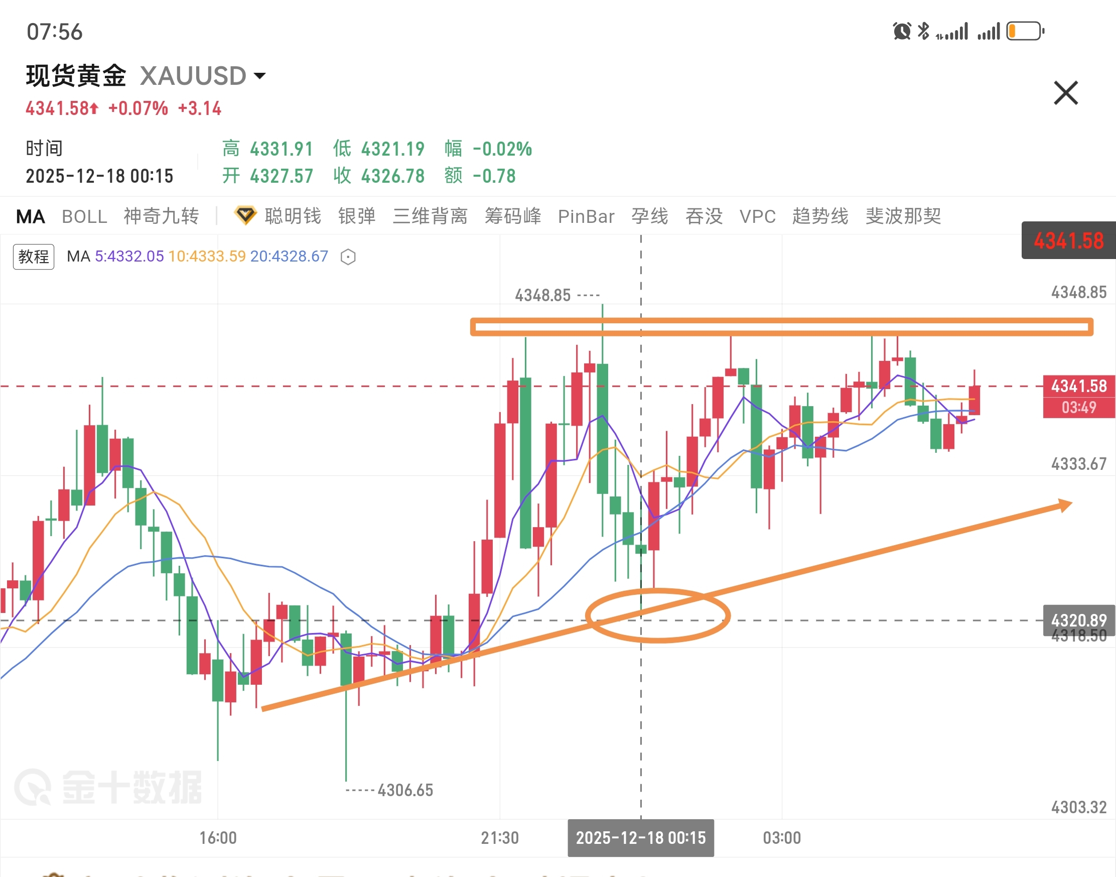 黄金,隔夜向上小冲了一波,盘中在4344提示不追高,而是短箜参与,凌晨也是如期跌回4320目标附近。尾盘迂回震荡,波动空间并不大。目前金价依旧维持在高位盘整,虽然没有强势破高,但结合基本面来看依然有较大可能去破高,短线方面维持回踩跟哆的思路,支撑在4320,4300,日内参考这两个点去多。#黄金投资讨论区#