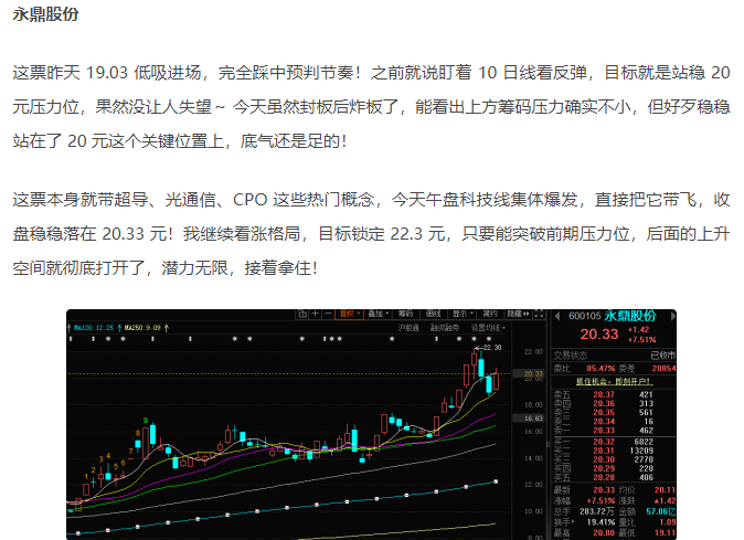 昨天下午午盘科技爆发,CPO,光通信,超导集体带飞,直接上天一度涨停可惜5日线附近筹码分布还是有点大,需要消耗下,所以在涨停期间很多散户趁机出货,主力也是随波逐流把散户震荡出去一些,该股小君还是看好今天站上5日线,剑指22.3的压力位,破而后立。短期小君看涨,小目标破压力位22.3,大目标25.5之上。昨作上干货: