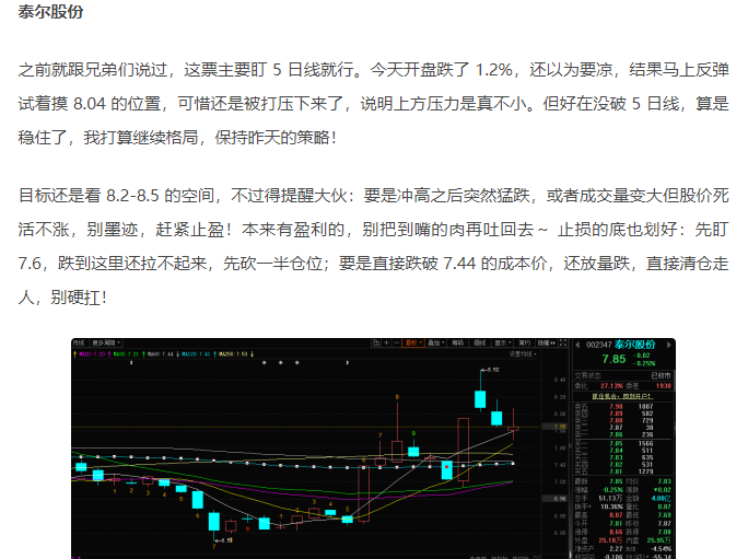 一些技术面的小君就不多说了昨晚的帖子上也说跟大家说了后续操作了,等下直接上干货,基本操作不变,昨天泰尔跌破5日线后面回调5日线之上,恰恰说明下面支撑位以确定只不过上面压力位有点大8.52附近的筹码太多了需要消化,虽然现在改股票是属于反弹但是最近量不上不下的还是需要板块出来爆发一下,还是需要一个契约,长期还是看涨。