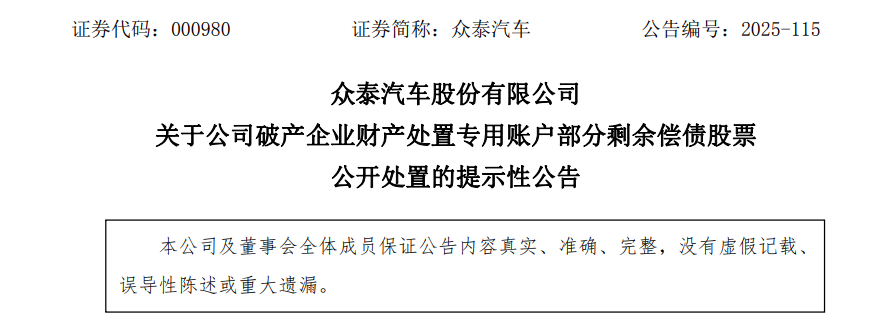 12月17日晚间,众泰汽车(000980)公告,公司计划于公司破产企业财产处置专用账户(以下简称“处置专户”)解除司法冻结之日(即2025年12月9日)起的三个月内通过集中竞价方式、大宗交易方式处置股份合计不超过公司股份总数的3%,即不超过1.51亿股。