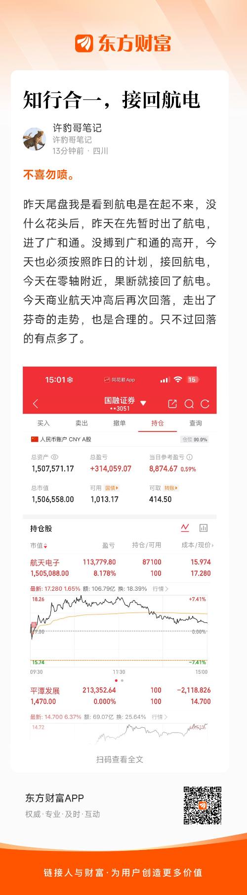 昨天尾盘我是看到航电是在起不来,没什么花头后,昨天在先暂时出了航电,进了广和通。没搏到广和通的高开,今天也必须按照昨日的计划,接回航电,今天在零轴附近,果断就接回了航电。今天商业航天冲高后再次回落,走出了芬奇的走势,也是合理的。只不过回落的有点多了。