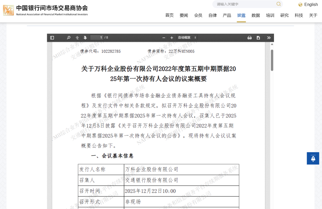 12月18日,记者从中国银行间市场交易商协会官网获悉,万科2022年度第五期中期票据2025年第一次持有人会议的议案概要已公布。