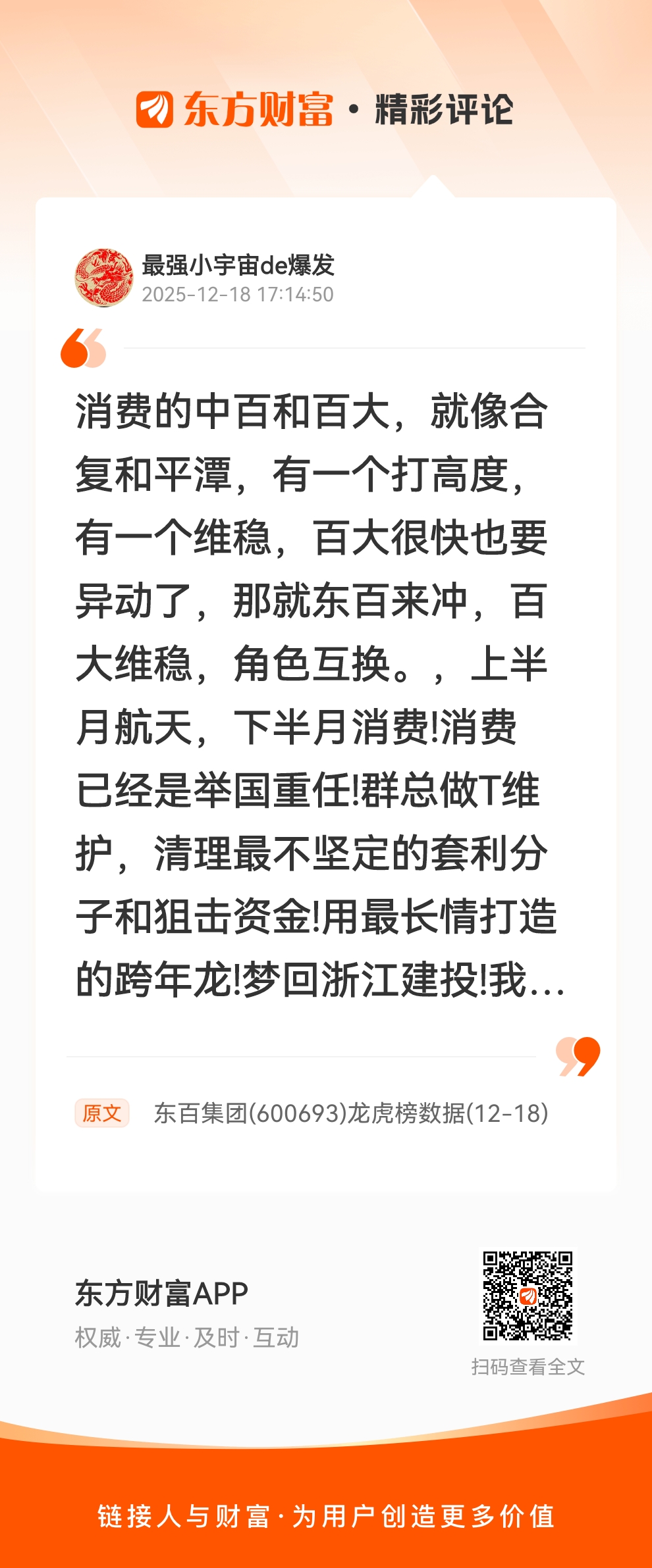 消费的中百和百大,就像合复和平潭,有一个打高度,有一个维稳,百大很快也要异动了,那就东百来冲,百大维稳,角色互换。,上半月航天,下半月消费!消费已经是举国重任!群总做T维护,清理最不坚定的套利分子和狙击资金!用最长情打造的跨年龙!梦回浙江建投!我站队群总!做兄弟在心中 我在《东百集团(600693)龙虎榜数据(12-18)》的评论获得了大家的关注。