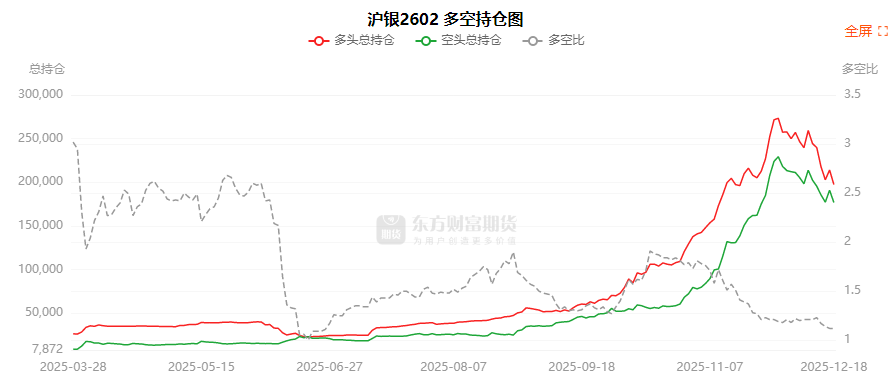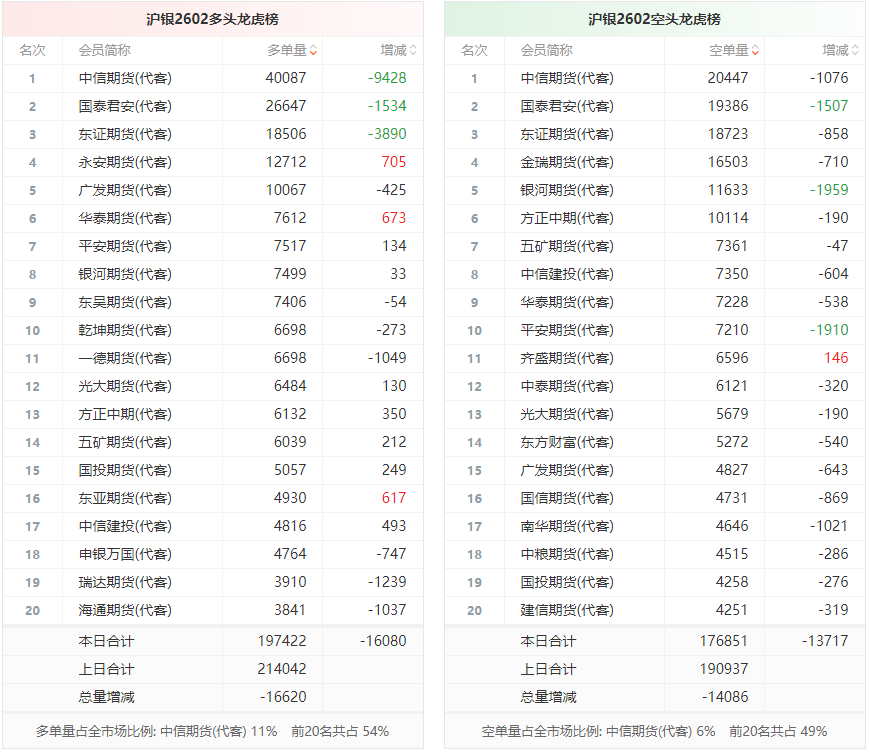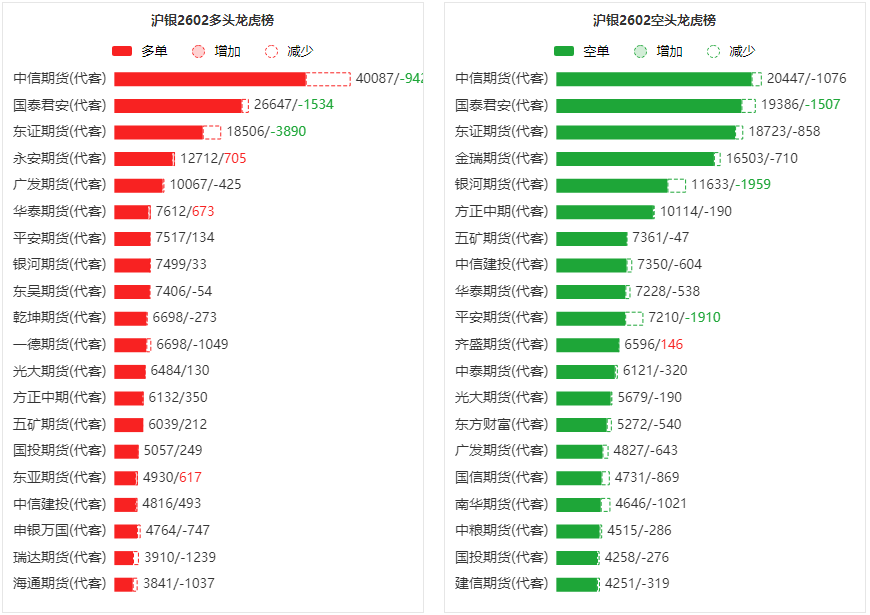 总体而言,沪银2602合约今日减仓上行,多空持仓排名前20席中,多空双方均呈退场态势,多头退场意愿强于空头。