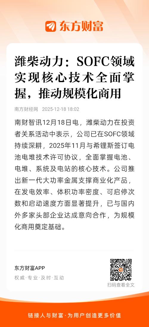南财智讯12月18日电,潍柴动力在投资者关系活动中表示,公司已在SOFC领域持续深耕,2025年11月与希锂斯签订电池电堆技术许可协议,全面掌握电池、电堆、系统及电站的核心技术。公司推出新一代大功率金属支撑商业化产品,在发电效率、体积功率密度、可启停次数和启动速度方面显著提升,已与国内外多家头部企业达成意向合作,为规模化商用奠定基础。