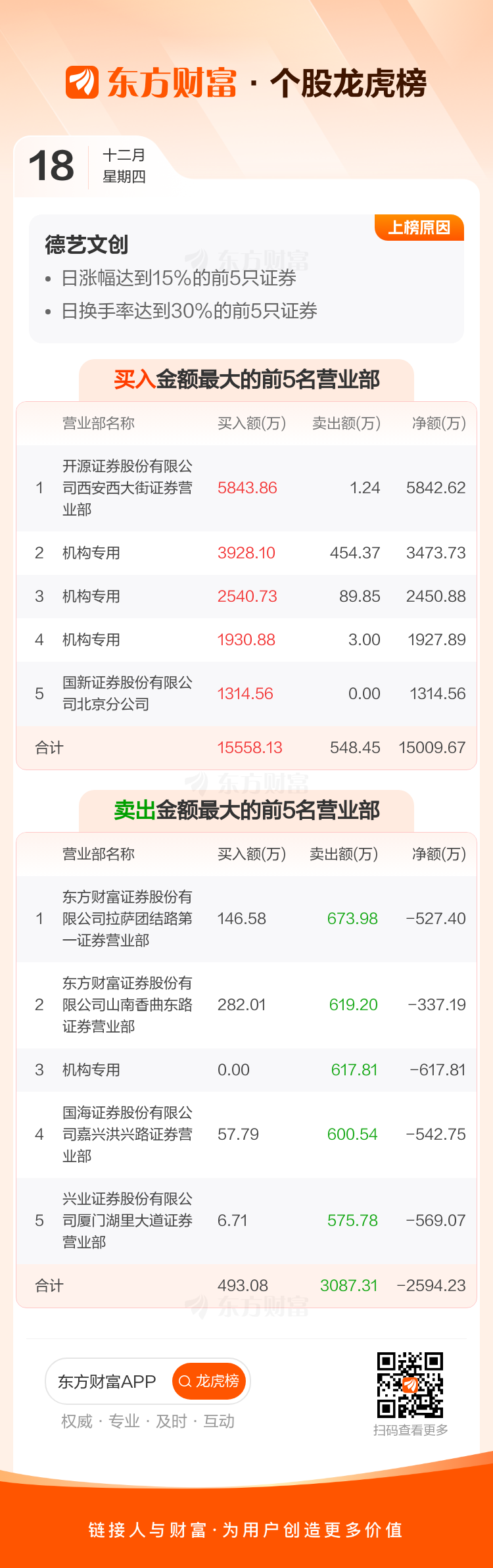 交易所2025年12月18日公布的交易公开信息显示,德艺文创因成为日换手率达到30%的前5只证券、日涨幅达到15%的前5只证券上榜。德艺文创当日收报8.86元,涨跌幅20.05%,偏离值39.21%,换手率39.21%,成交额7.28亿。