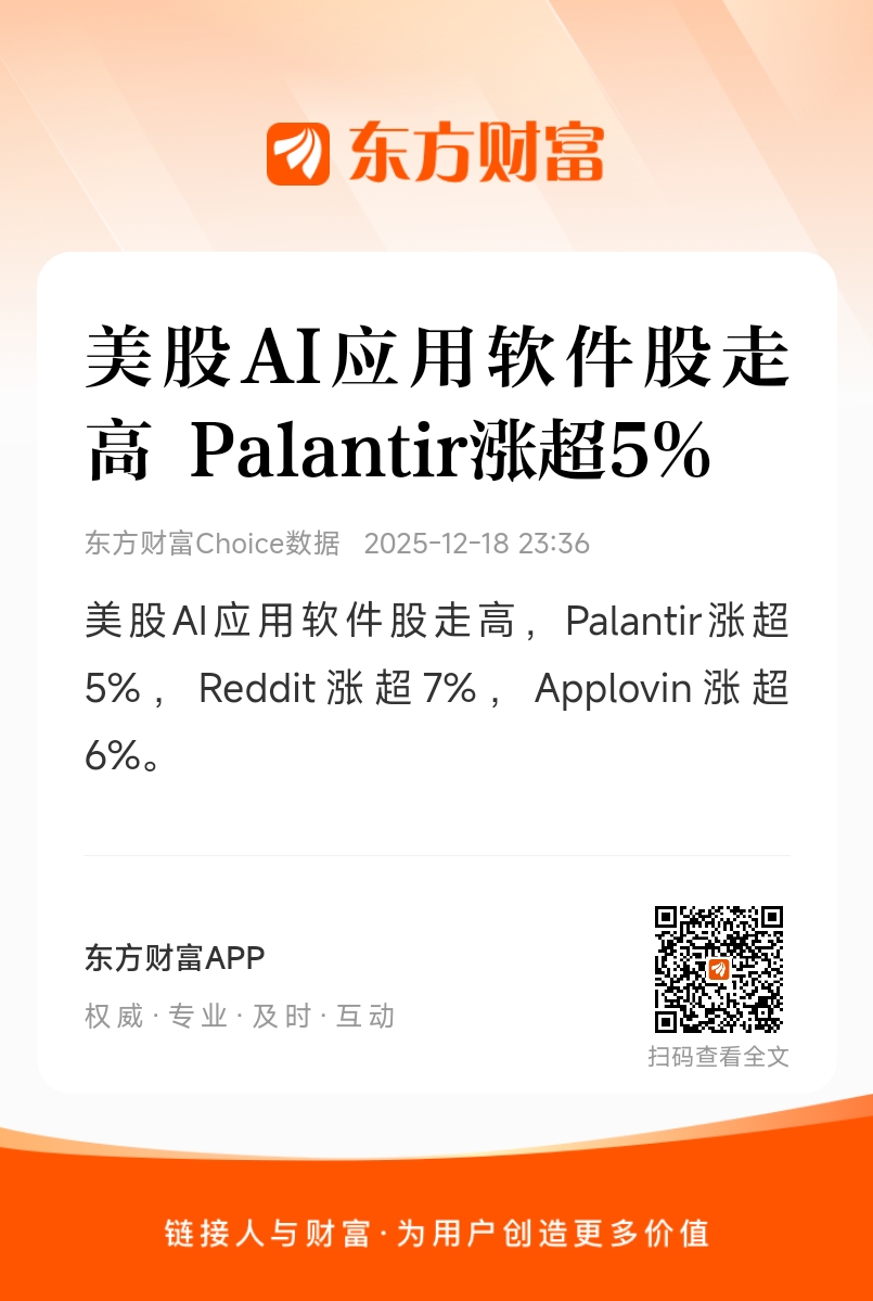 美股AI应用软件股走高,Palantir涨超5%,Reddit涨超7%,Applovin涨超6%。