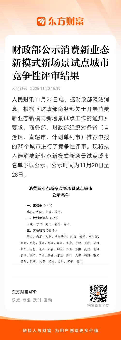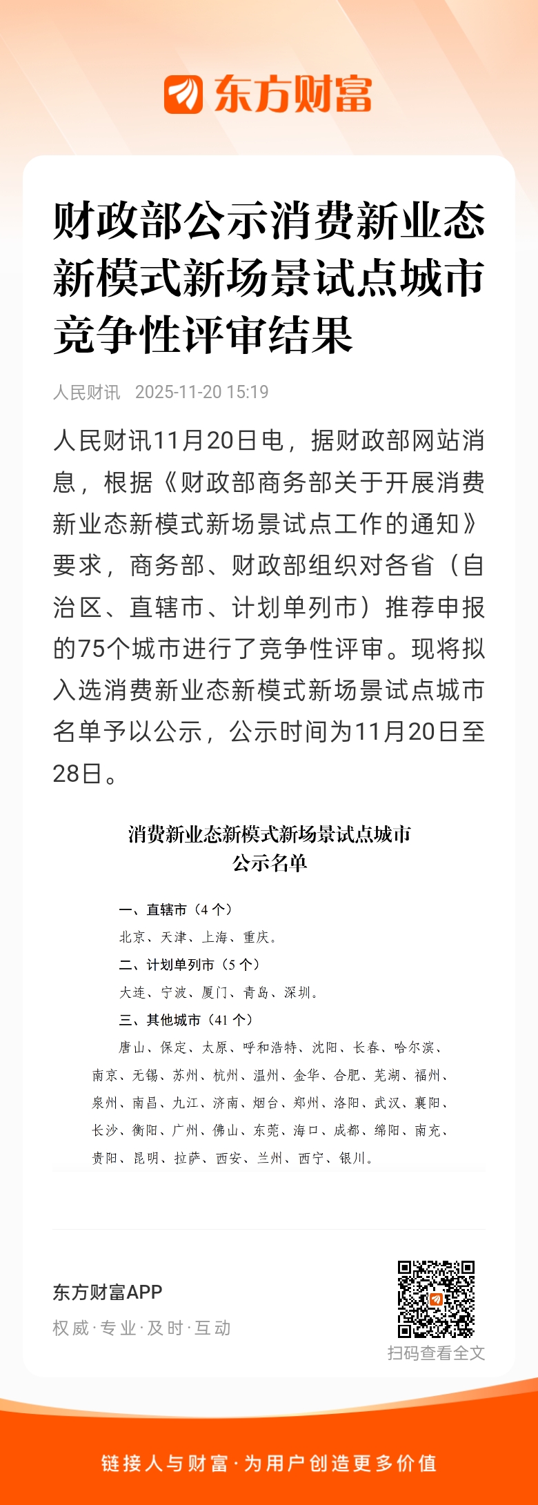 人民财讯11月20日电,据财政部网站消息,根据《财政部商务部关于开展消费新业态新模式新场景试点工作的通知》要求,商务部、财政部组织对各省(自治区、直辖市、计划单列市)推荐申报的75个城市进行了竞争性评审。现将拟入选消费新业态新模式新场景试点城市名单予以公示,公示时间为11月20日至28日。