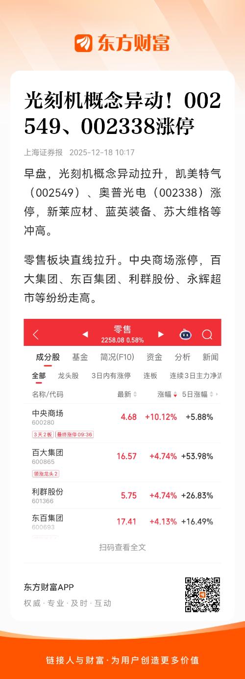 零售板块直线拉升。中央商场涨停,百大集团、东百集团、利群股份、永辉超市等纷纷走高。