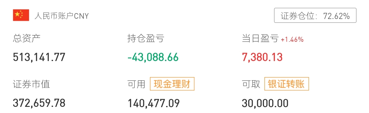 人民币证券仓位超七成,总资产稳健增长,当日收益飘红。持仓盈亏波动中,现金理财灵活备用。