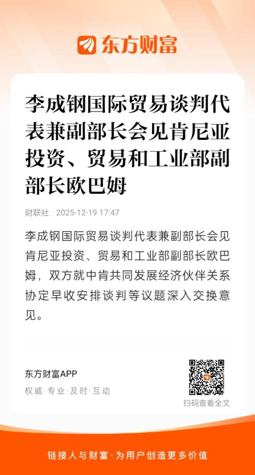 李成钢国际贸易谈判代表兼副部长会见肯尼亚投资、贸易和工业部副部长欧巴姆,双方就中肯共同发展经济伙伴关系协定早收安排谈判等议题深入交换意见。