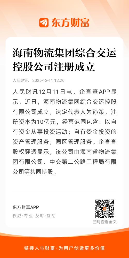 人民财讯12月11日电,企查查APP显示,近日,海南物流集团综合交运控股有限公司成立,法定代表人为孙策,注册资本为10亿元,经营范围包含:以自有资金从事投资活动;自有资金投资的资产管理服务;园区管理服务。企查查股权穿透显示,该公司由海南省物流集团有限公司、中交第二公路工程局有限公司等共同持股。