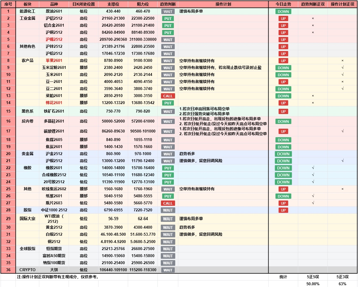 图一:【20251218期货品种复盘】趋势判断正确率50.00%,操作计划正确率63%