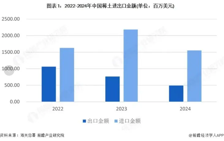 根据前瞻产业研究院依据海关总署的数据统计,在最近3年里,我国的稀土进口金额一直大幅高于出口金额。2025年一季度也是如此,进口数量为24679.1吨、金额为18.7亿元,同期出口数量为14177.6吨、金额为9.2亿元。