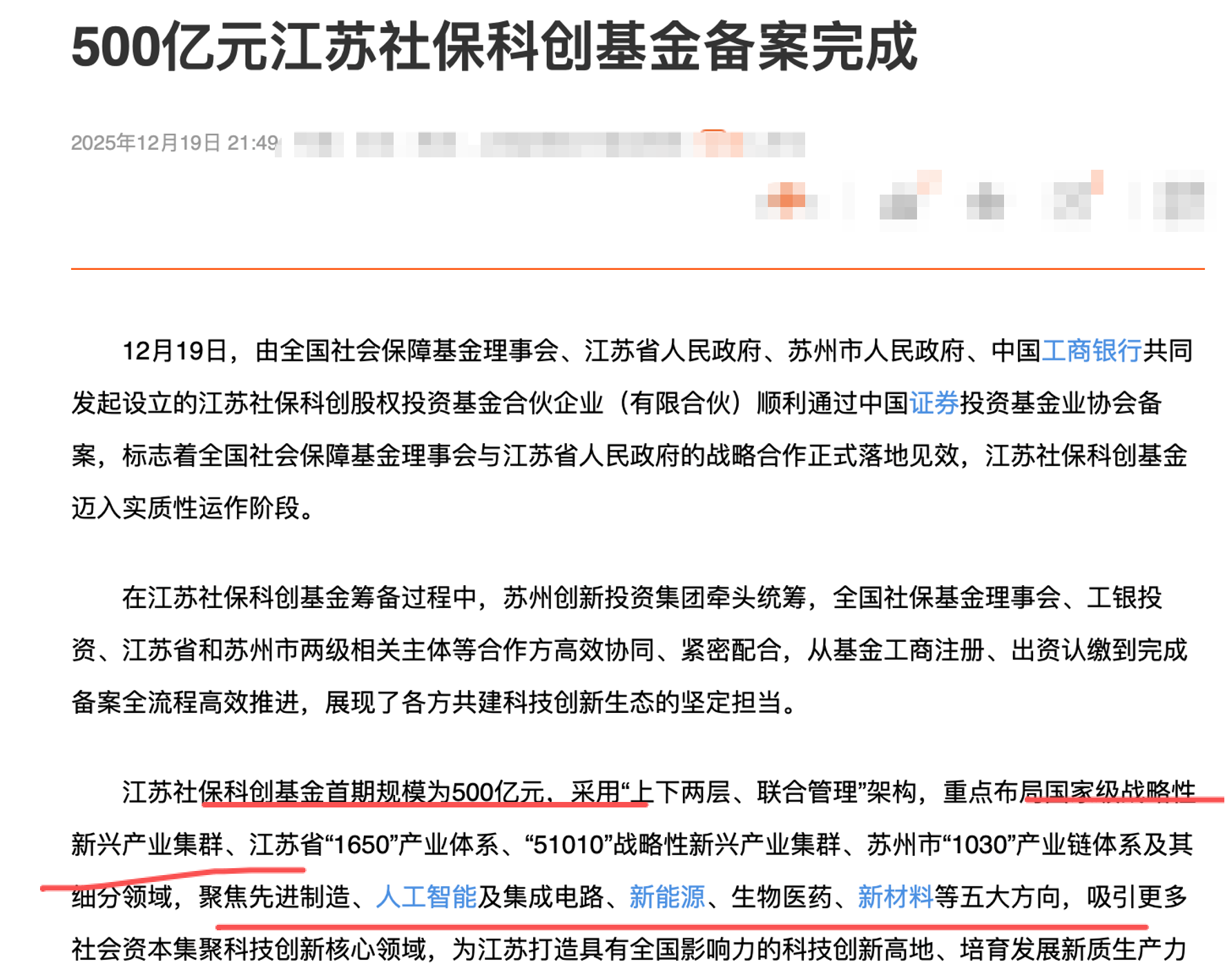2025年马上结束,2026年即将开始,就在这辞旧迎新的关键时刻,江苏社保基金科创基金备案完成,这500亿试水资金即将开始投资,可以说这是打头阵,未来社保基金还会有大量的资金开启投资。