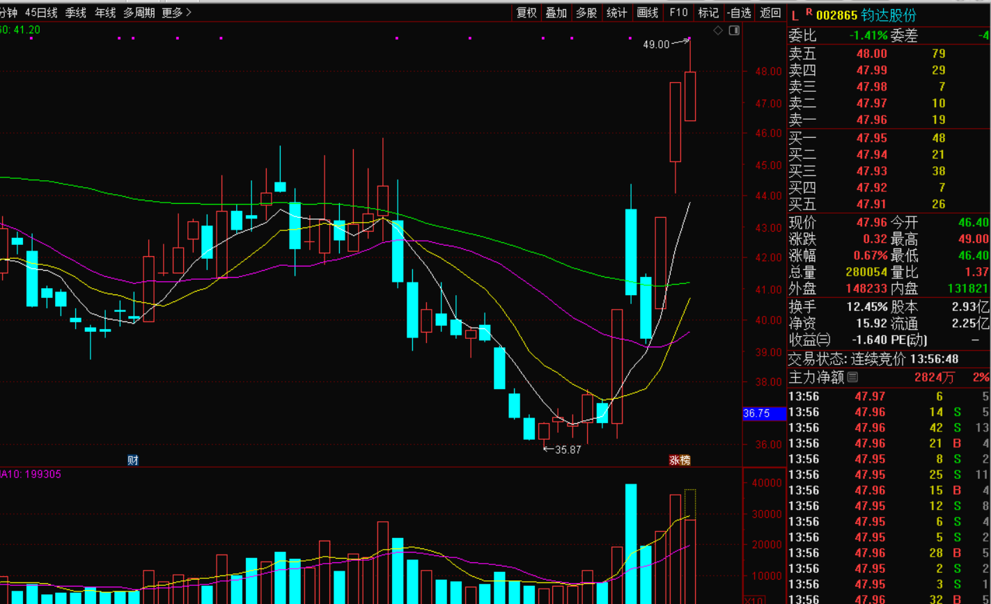 钧达股份002865,是光伏概念股,近期出现两连板的强势行情,光伏板块似乎没有走强的逻辑,经过研究原来它是在炒海南板块,这个板块前期出过很多妖股,本以为行情已经偃旗息鼓,没想到游资这么大胆,不怕板块6连阴,逆市连续拉涨停,这不是妖是什么,敢死队准备上场。周五低开高走,微涨收盘,空中加油的盘感,开盘就拉了5%,没有下影线,做多还是猛的,今天应该有机会赚钱。
