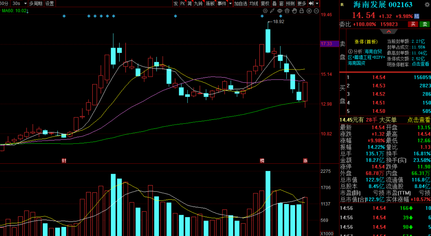 上周海南板块出现6连阴后,回踩到60日线得到强烈支撑,周五出现强势反弹,板块大涨5%,龙头股海南发展底部反弹,首板涨停,风险相对较少,可以关注。