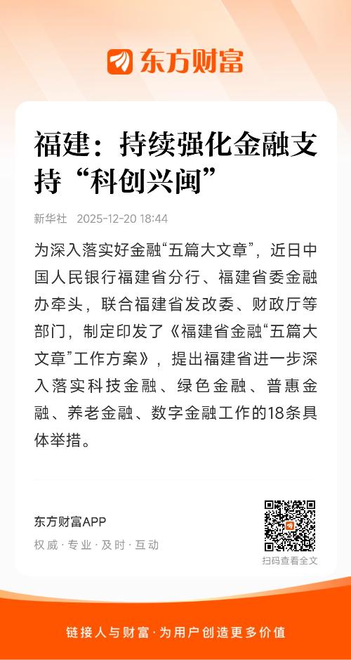 为深入落实好金融“五篇大文章”,近日中国人民银行福建省分行、福建省委金融办牵头,联合福建省发改委、财政厅等部门,制定印发了《福建省金融“五篇大文章”工作方案》,提出福建省进一步深入落实科技金融、绿色金融、普惠金融、养老金融、数字金融工作的18条具体举措。