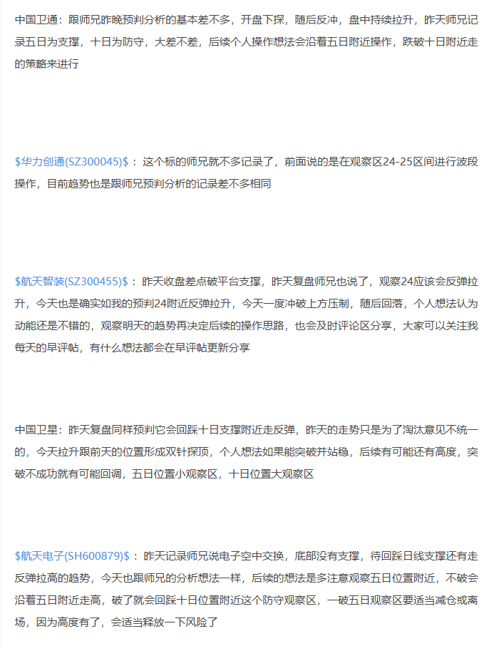 以上是师兄对周一个股的分析想法,目前航天的板块效应还是不错的,整体还是市场的主流,周末航天利好消息不断,但是师兄再想以现在的行情高度,再次出现这么大的利好,反而不是什么好事,毕竟市场是反人性的,很多借着利好兑现的大有人在,所以要跟进航天行情,建议还是多观察低位的