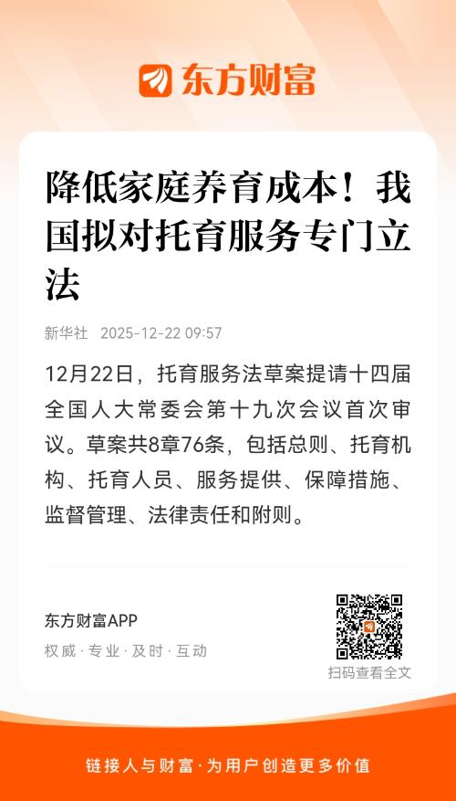 12月22日,托育服务法草案提请十四届全国人大常委会第十九次会议首次审议。草案共8章76条,包括总则、托育机构、托育人员、服务提供、保障措施、监督管理、法律责任和附则。