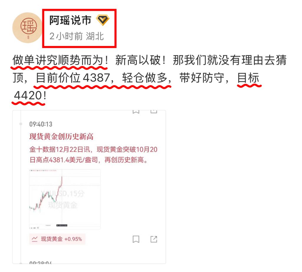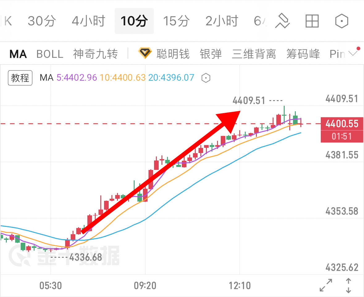 看涨做多!公开提示在4387直接多看涨4420!最高来到了4410附近!丝滑入库
