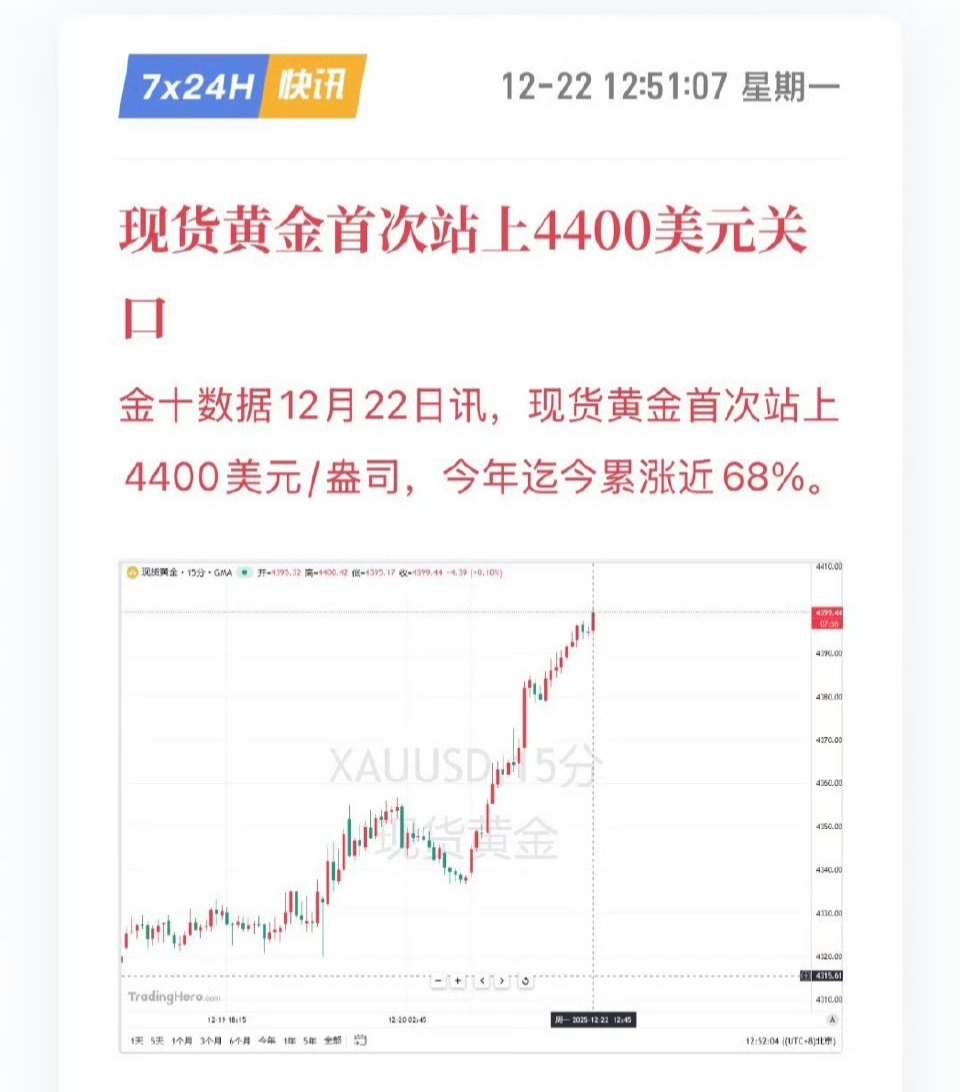 黄金强势冲破4400美元历史新高!美联储降息预期持续升温、全球地缘冲突发酵,双buff叠加助推多头行情如火如荼,盈利效应拉满。但圣诞节假期临近,获利盘了结压力隐现,这波疯涨会不会突然按下暂停键?