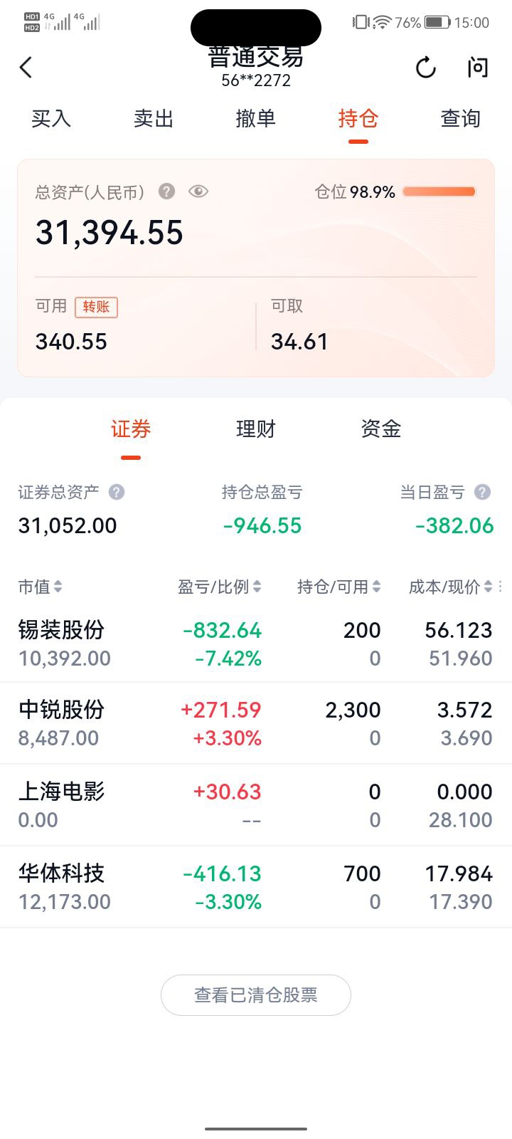 转出300,本:30200,出了上影,中锐出了一部分,进了华体,锡装T了一下,成本降了9分