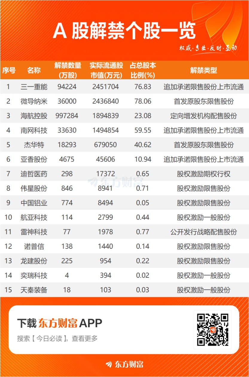 从解禁市值看,东方财富Choice数据显示,明日面临解禁的15只股票中,三一重能、微导纳米、海航控股居前,解禁市值分别为245.17亿元、243.68亿元、189.48亿元。解禁比例方面,微导纳米、三一重能、南网科技分别为78.06%、76.83%、59.55%,居于前列。