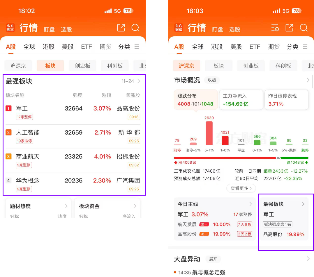 功能入口:最强板块(行业板块、概念板块)、题材强度榜(题材)