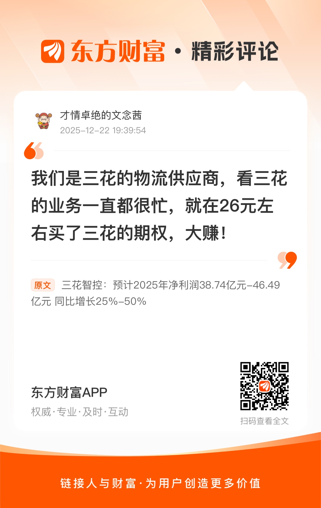 我们是三花的物流供应商,看三花的业务一直都很忙,就在26元左右买了三花的期权,大