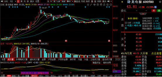 作为国内电机与工业自动化核心企业,在新能源电机赛道具备技术与市场优势。昨日高开后震荡走高,午后封死涨停,随后涨停板开板引发分歧,但下方承接表现强劲,抛压涌出后被快速消化。主力虽有部分筹码兑现,但承接托举效果明显。开板阶段量能有所放大但未超前期天量,回封后直至收盘未再开板多头最终占上风。今日需紧盯昨日涨停附近支撑,若能站稳分歧时有承接,则后续更易延续强势;若回踩撑得住量能配合,则仍有继续向上空间,值得关注。