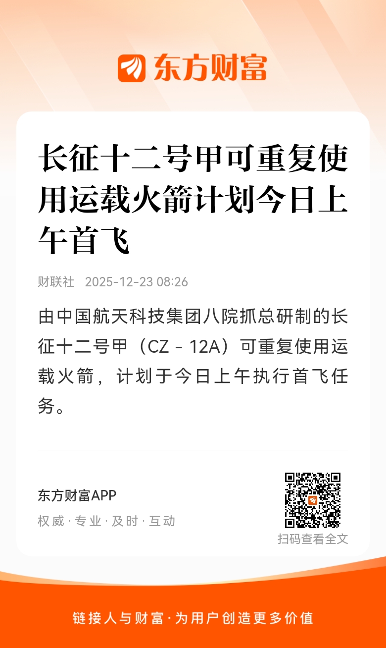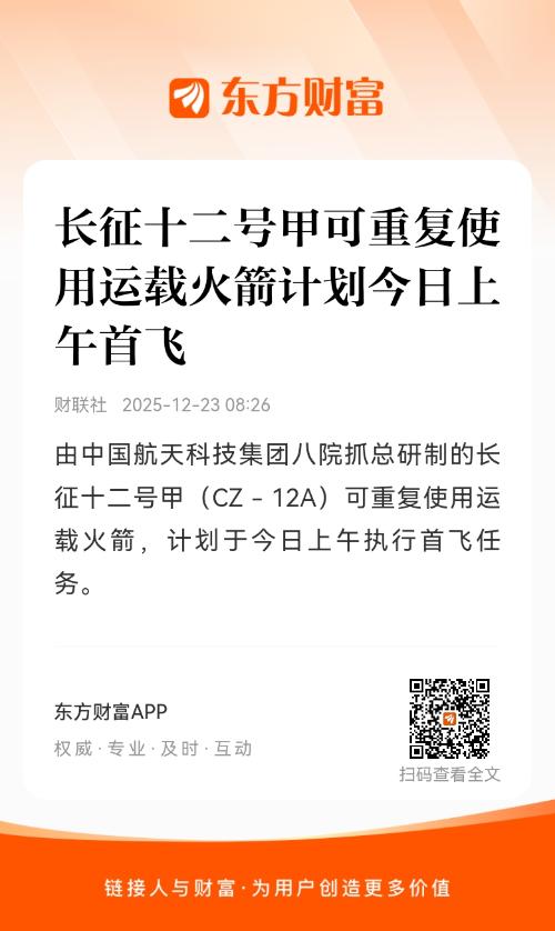 近期商业航天催化不断。据每日经济新闻,继朱雀三号发射成功后,2025年12月中旬长征十二号甲(CZ-12A)有望迎来首飞,并同步尝试一级火箭的垂直回收。