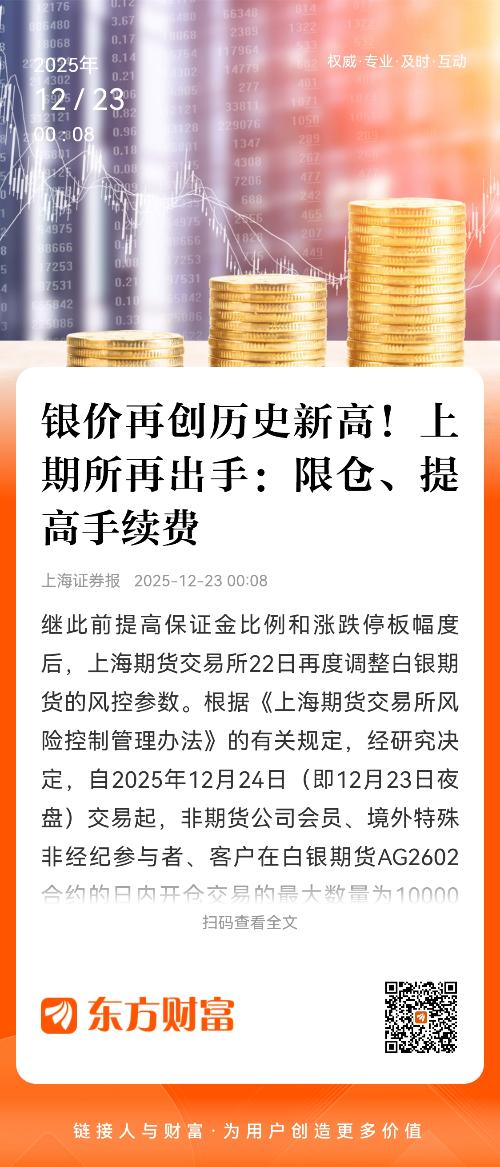 根据《上海期货交易所风险控制管理办法》的有关规定,经研究决定,自2025年12月24日(即12月23日夜盘)交易起,非期货公司会员、境外特殊非经纪参与者、客户在白银期货AG2602合约的日内开仓交易的最大数量为10000手。实际控制关系账户组日内开仓交易的最大数量按照单个客户执行。套期保值交易和做市交易的开仓数量不受此限制。