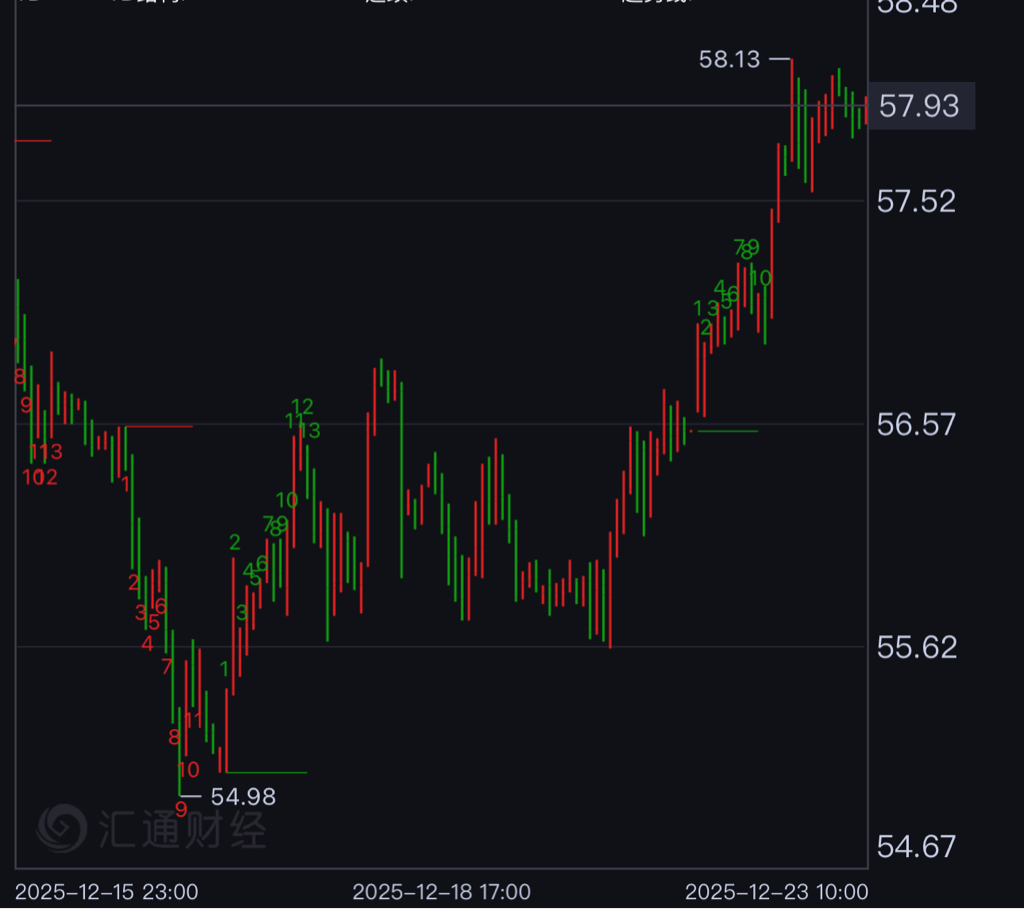 原油昨天一开盘就涨,收盘也是上涨的走势。今天的思路是,跌到57.2附近就做多;如果走势很强,跌到57.5就可以先做多,目标看到58到58.5;涨到接近59的时候,再考虑空
