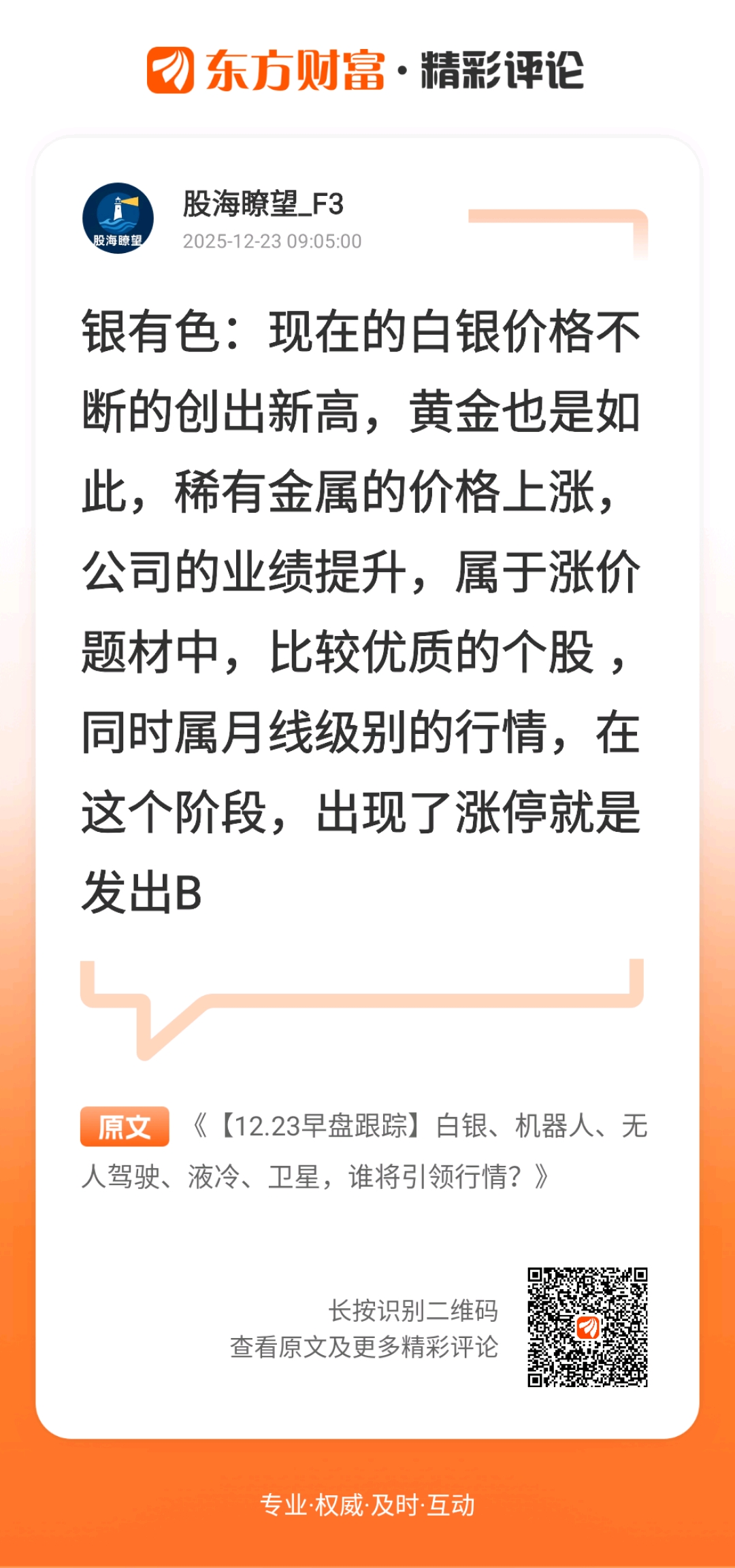 //@股海瞭望_F3 :银有色:现在的白银价格不断的创出新高,黄金也是如此,稀有金属的价格上涨,公司的业绩提升,属于涨价题材中,比较优质的个股 ,同时属月线级别的行情,在这个阶段,出现了涨停就是发出B