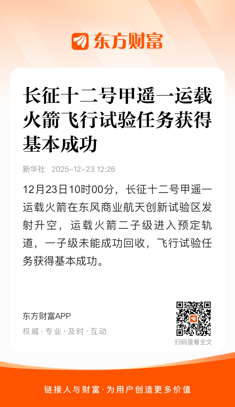 新华社酒泉12月23日电 12月23日10时00分,长征十二号甲遥一运载火箭在东风商业航天创新试验区发射升空,运载火箭二子级进入预定轨道,一子级未能成功回收,飞行试验任务获得基本成功。