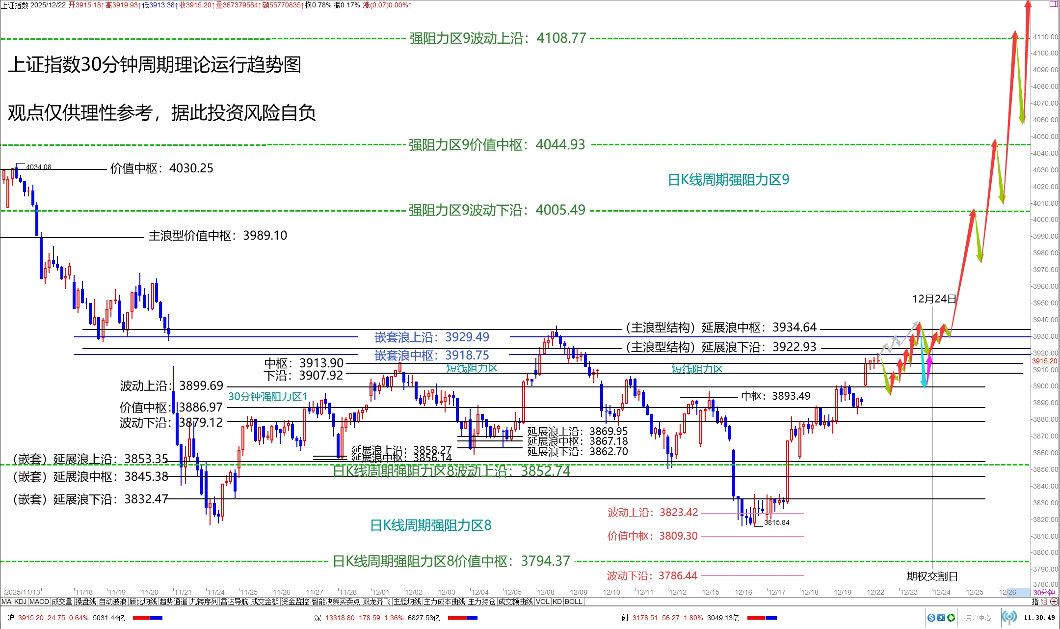 观察一下,沪指接下来是否会发展成为“紫青箭头”部分所示的走势!